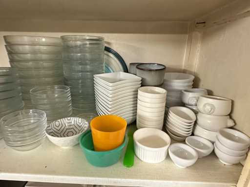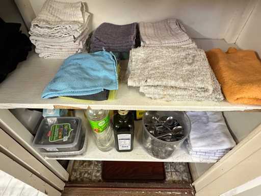Deze inhoud bestaat uit serviesgoed, doeken, vergiet en overige keukenbenodigdheden.