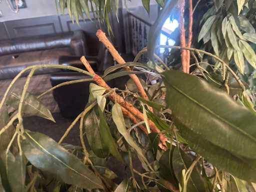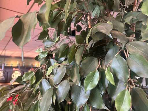 Deze kunst Ficus zit in een zware metalen pot met grind.