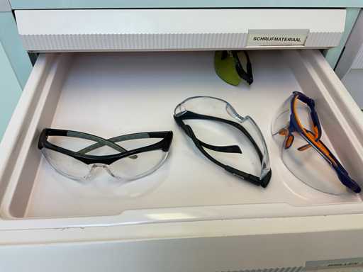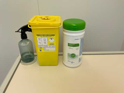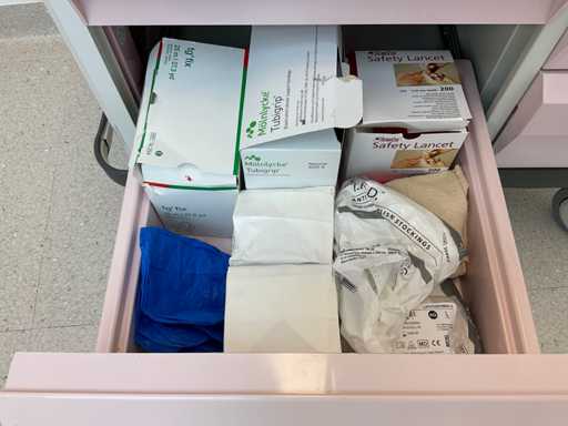 Diverse inhoud bestaande uit markers, stuwband, veiligheidsbrillen, tubigrip, lancetten, steunkousen, zakken tbv afzuigsysteem, naalden container