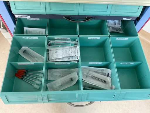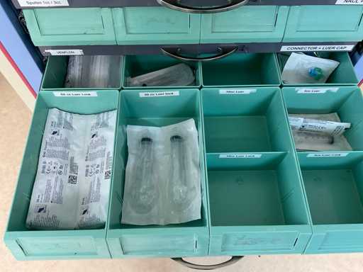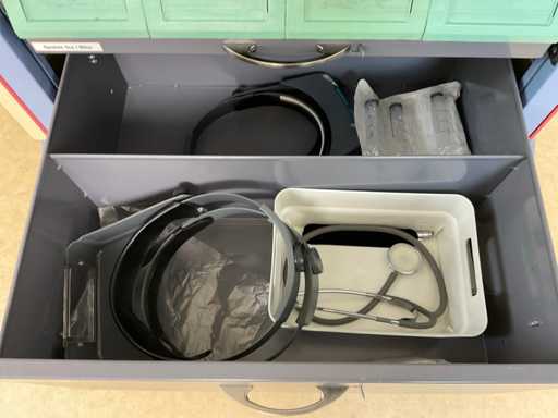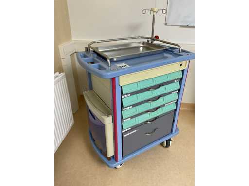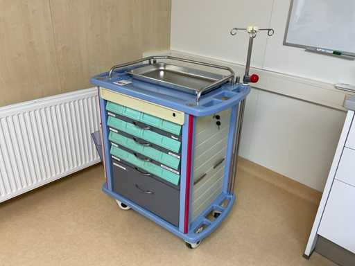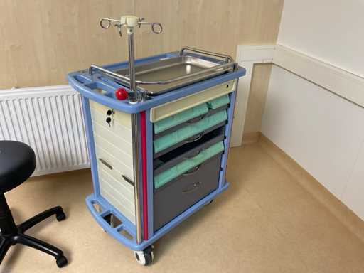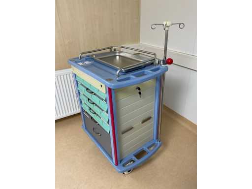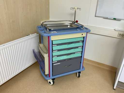 Voorzien van 5 laden met inhoud, zijvak, 4 geremde wielen en in hoogte verstelbare infuuspaal