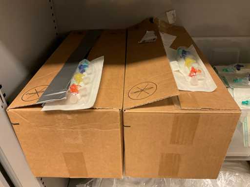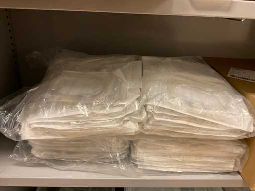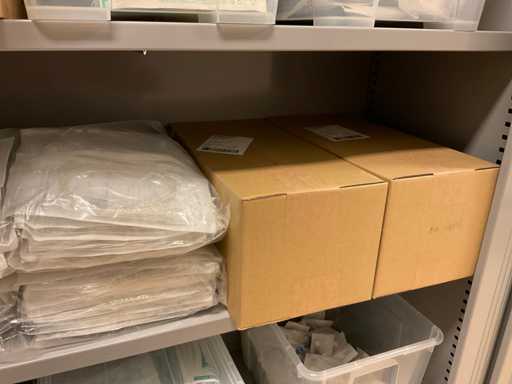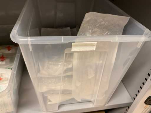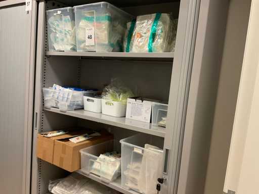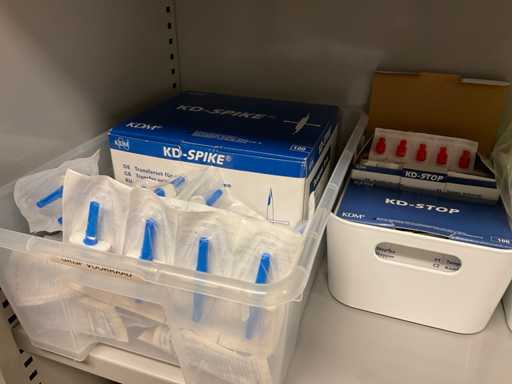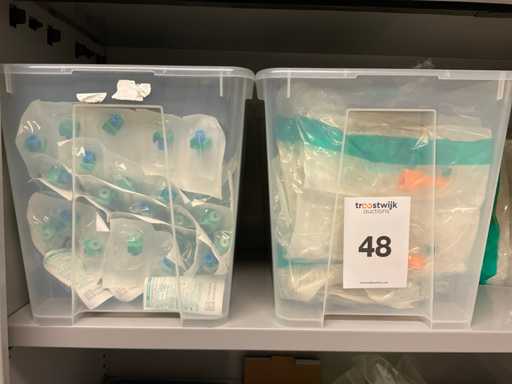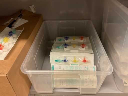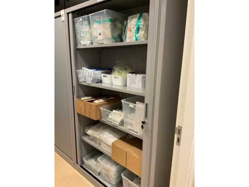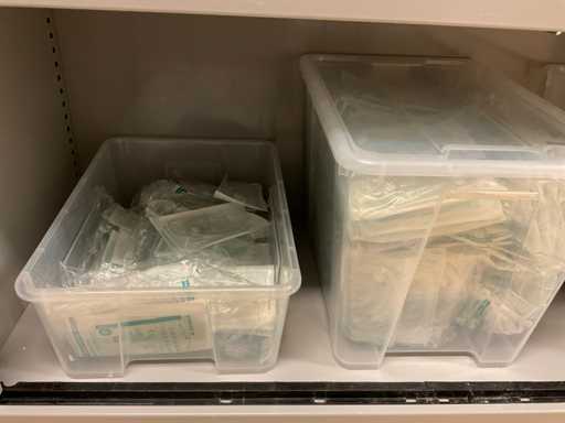 Inhoud kast bestaande uit kunststof bakken met voorraad waaronder infuuslijnen, infuus zijlijnen, driewegkraantjes, stoppen, venflons, vlindernaaldjes