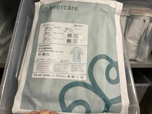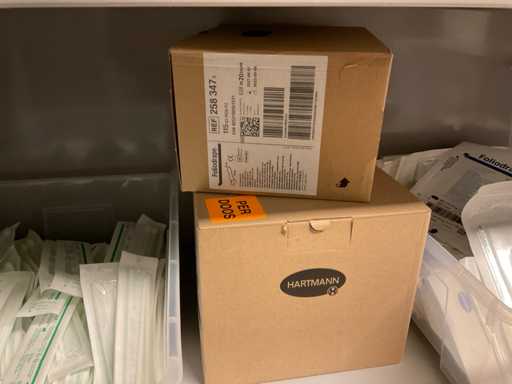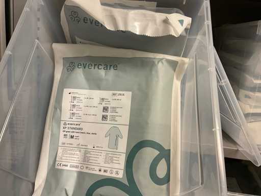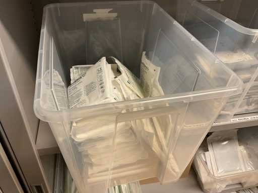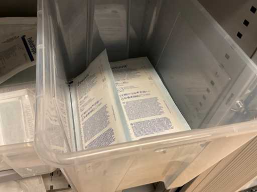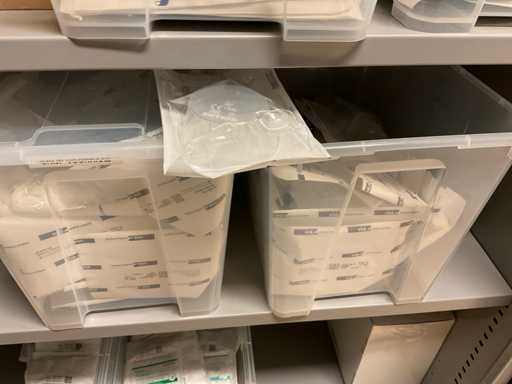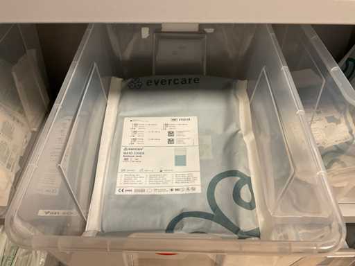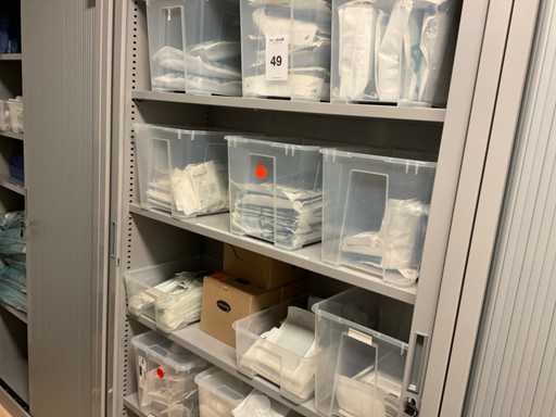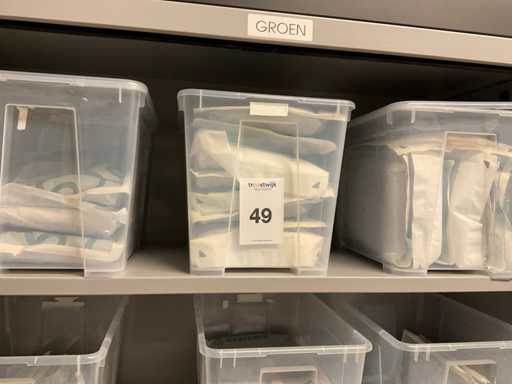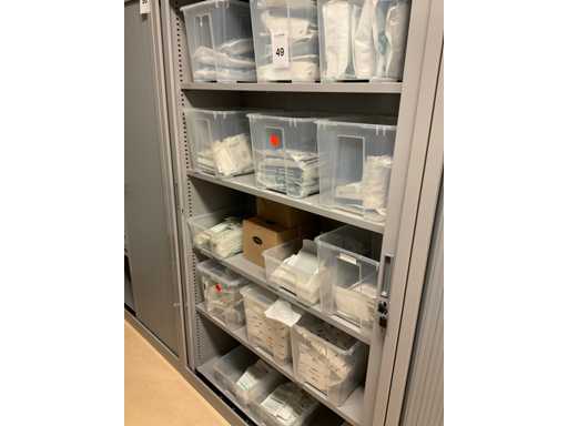 Inhoud kast met diverse steriele doeken, swaps, covers en chirurgische handschoenen