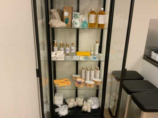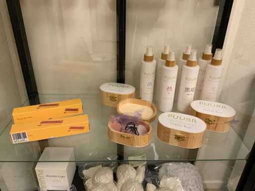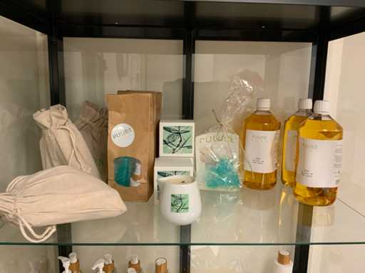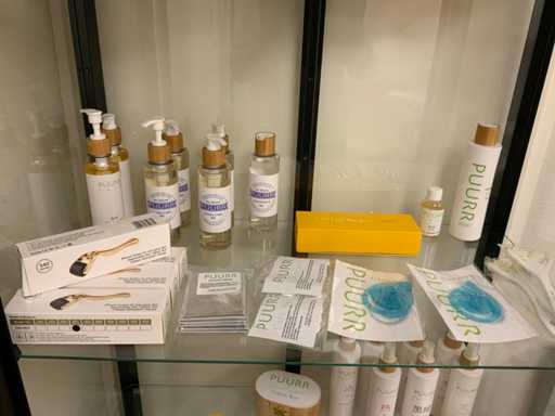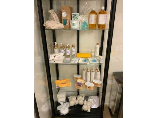 Diverse producten waaronder body oil, massage kaarsen, collageen stimulatie apparaten, energy bar chimes, oplegstenen en kruidenstempels