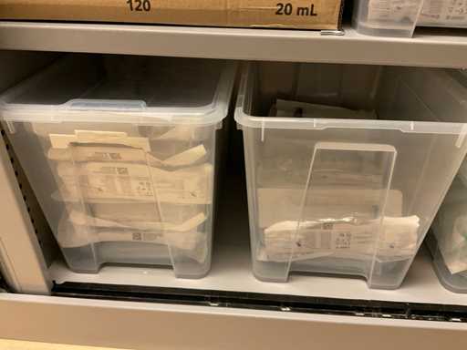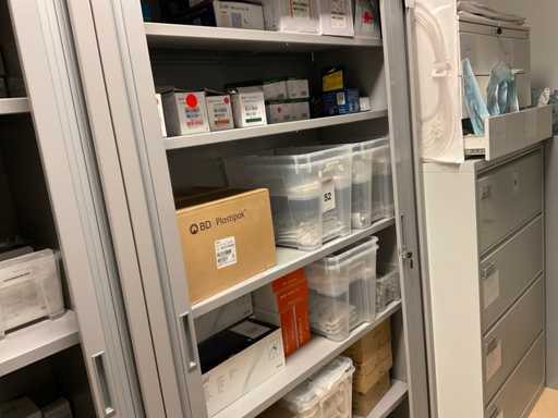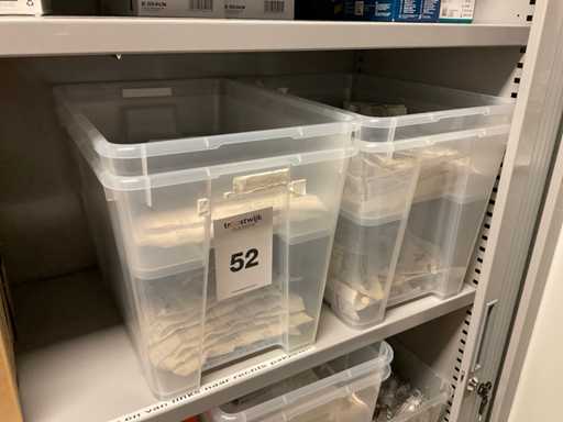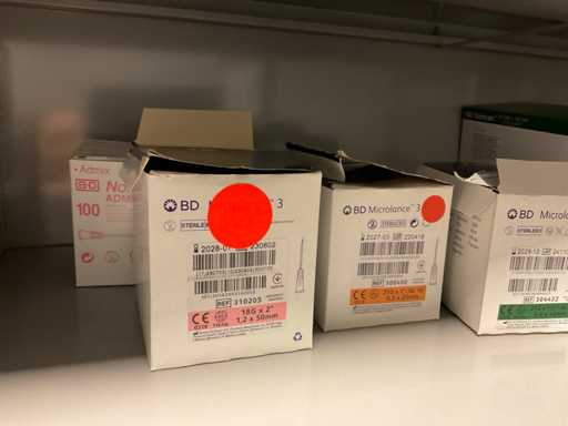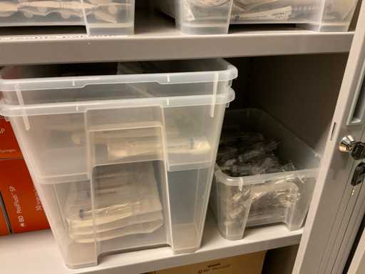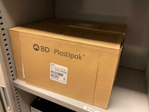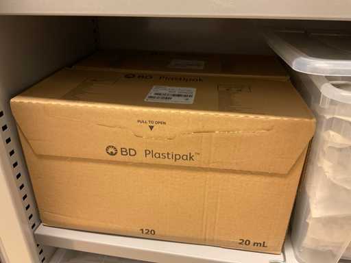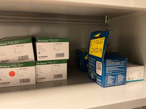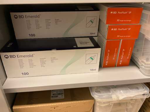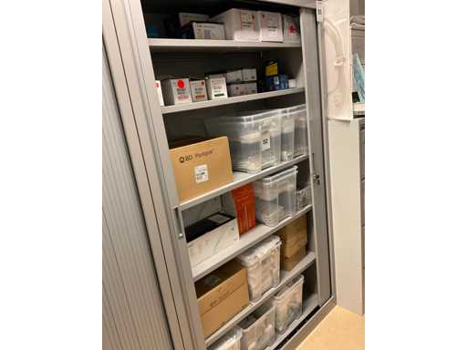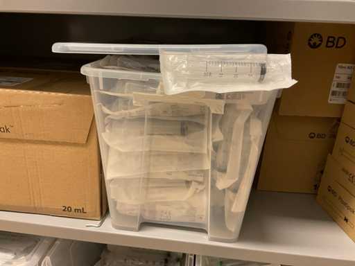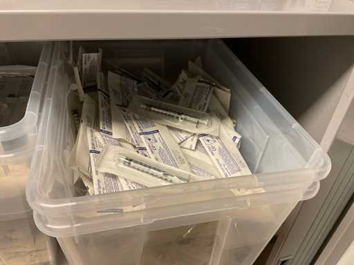 Inhoud kast bestaande uit diverse formaten spuiten, 10 ml, 20 ml, spoel vloeistof Nacl 0,9, diverse formaten injectie naalden
