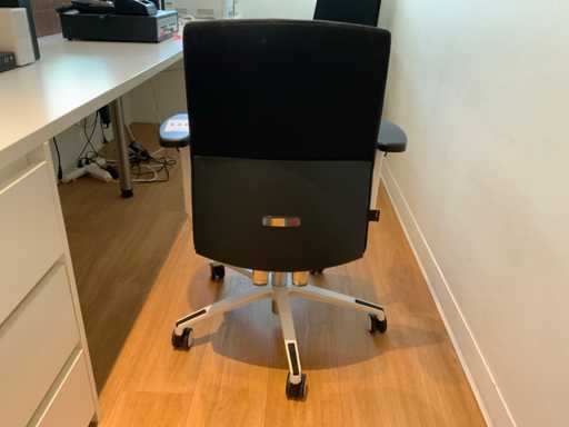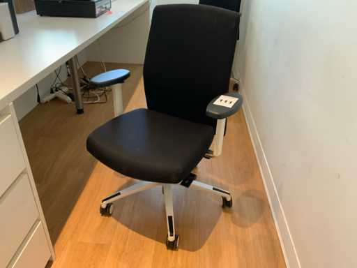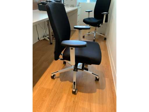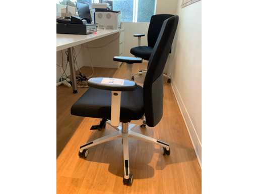 Voorzien van in hoogte verstelbare armleuningen, zwart gestoffeerde bekleding en wit onderstel