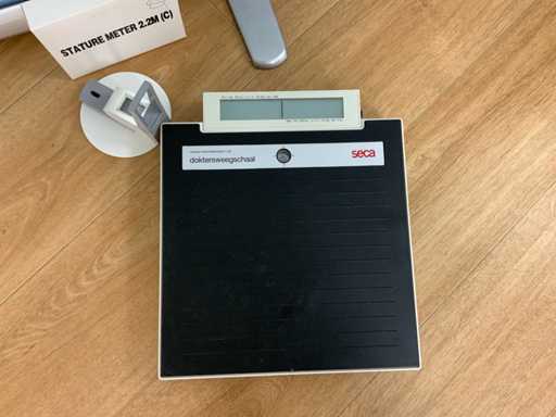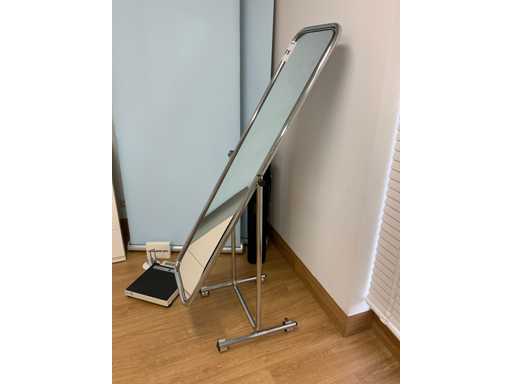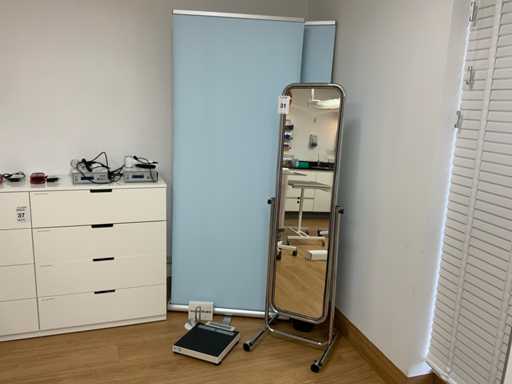 Bestaande uit weegschaal en meetlint, spiegel op verrijdbaar onderstel afm ca. 50x45x165 cm en 2 stuks roll up banners zonder print