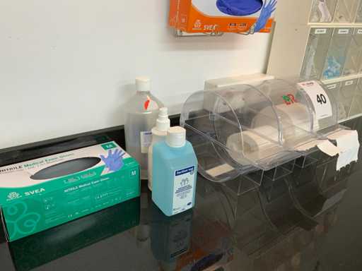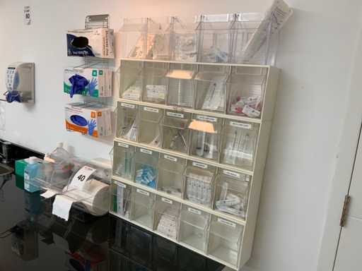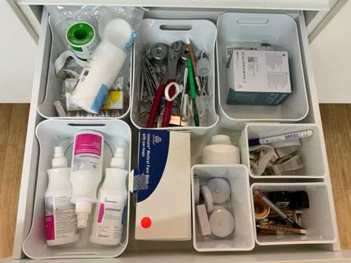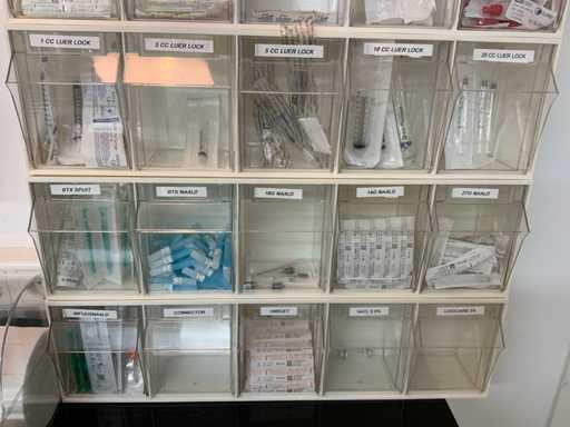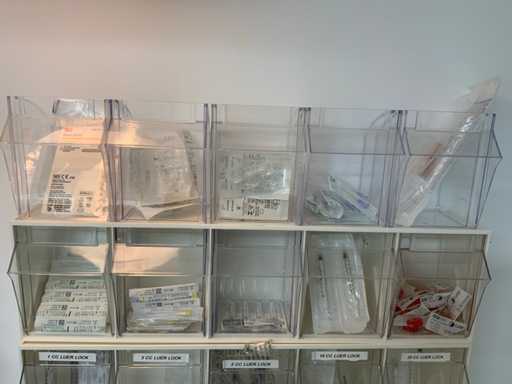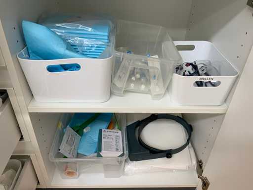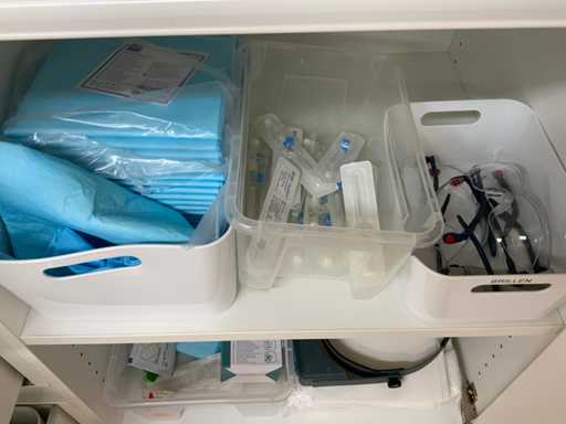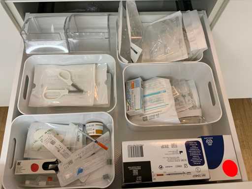 Inhoud keukenblok bestaande uit diverse spuiten naalden, desinfect, schorten, brillen, infuusnaalden