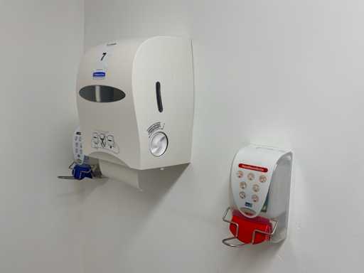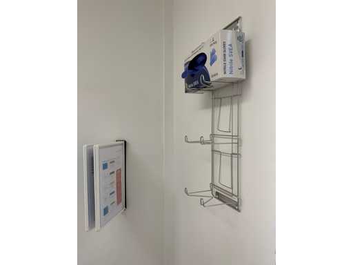 Bestaande uit wandgemonteerde papier dispenser, zeepdispenser, handdesinfectie dispenser, A4 folder display en dozen houder