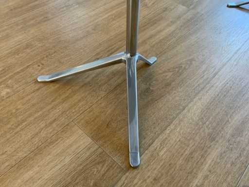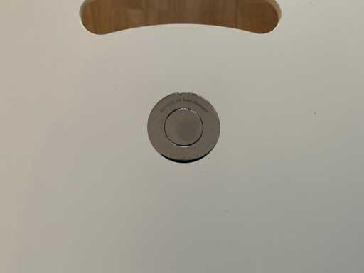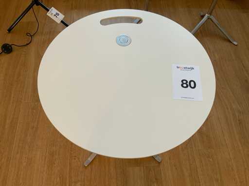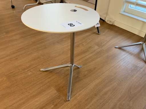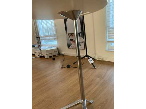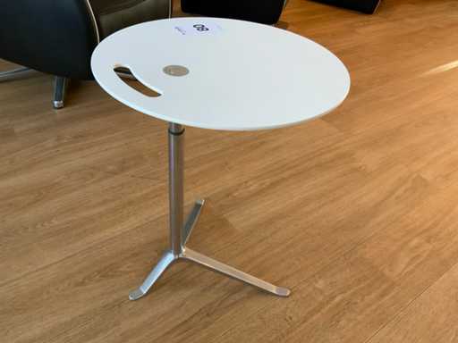 Ontwerp door Kasper Salto, wit laminaat blad met chromen onderstel, in hoogte verstelbaar d.m.v. drukknop in het blad