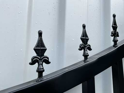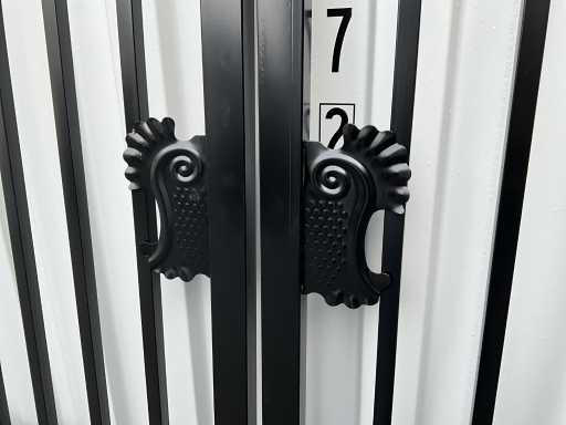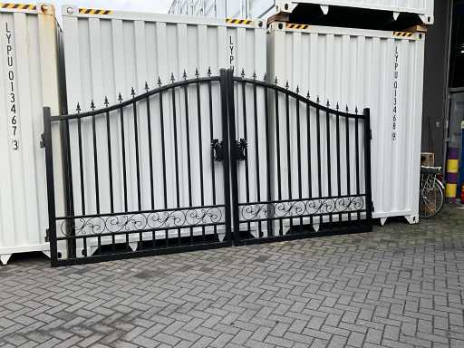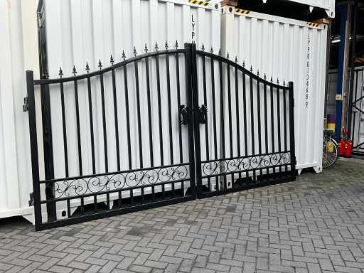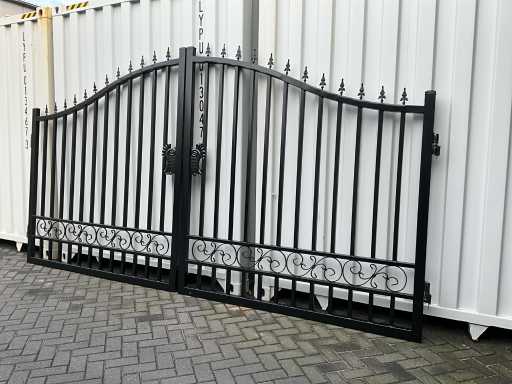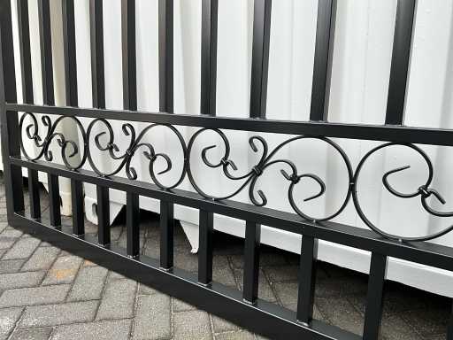 poort van staal, zwarte coating, 422 cm breed, Hoogte; van 180 cm naar 230 cm ( buiten naar binnen), frame buiten kant 50 x 50 mm, spijlen 25 x 25 mm, aanlaspaumelle, ongebruikt