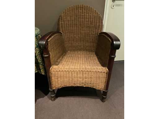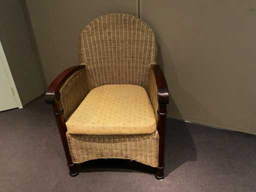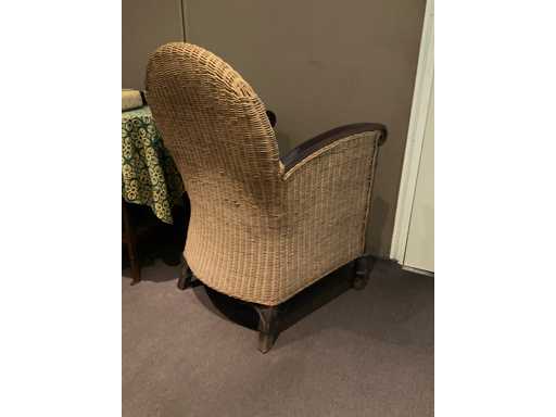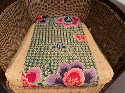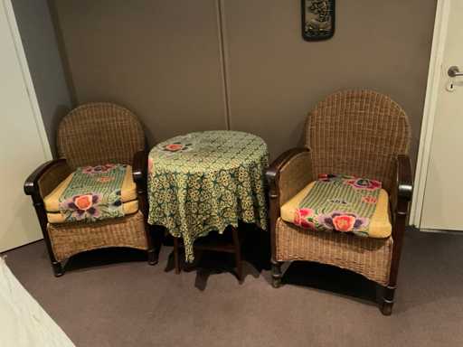 Afmeting tafel: 65 cm diameter, 73 cm hoog. Afmeting stoel: 90 cm hoog, 60 cm breed, 60 cm diep, 35 cm zithoogte. 1 stoel niet op foto.