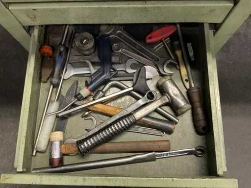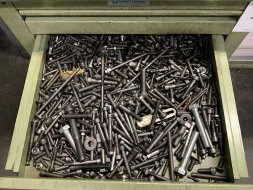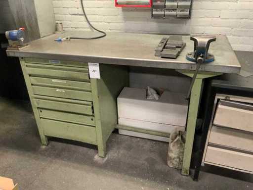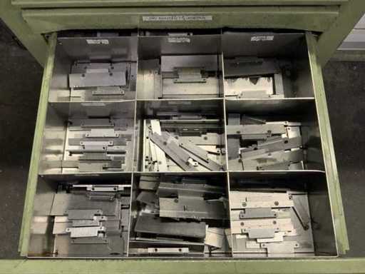 waaronder: 1 Overtoom werkbank en 1 bureau, blad afmeting: L1500 x B755 mm, met inhoud, waaronder klikplaatjes, aantrekbouten, spantangen, opspangereedschap. inclusief 2 assortiment ladekastjes met tappen en boren