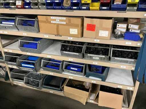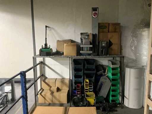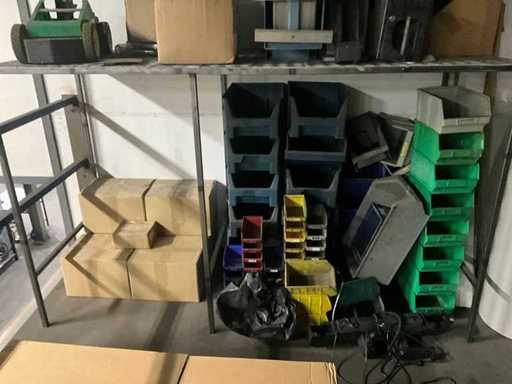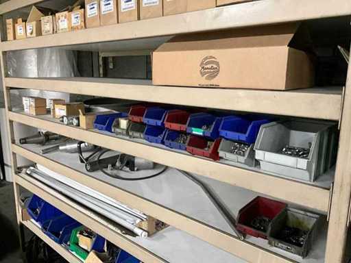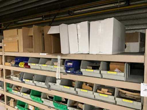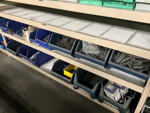 Waaronder schroeven, bouten, moeren, verpakkingsmaterialen etc. in en met 3 sectie stelling voorzien van magazijnbakken, totaal afmeting 6150x800x2100 mm; inclusief stalen rek met magazijnbakken en divers