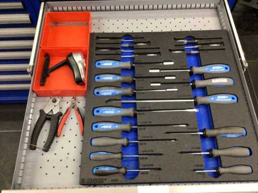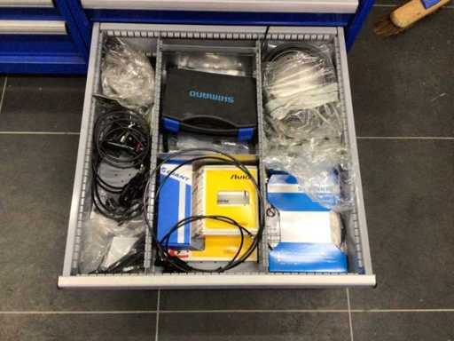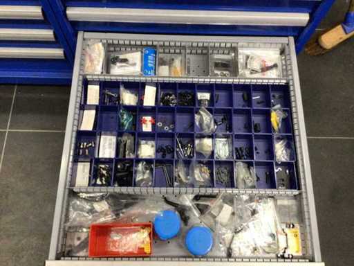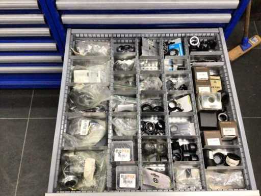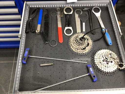Partij fietsonderdelen in 8 laden, exclusief kast