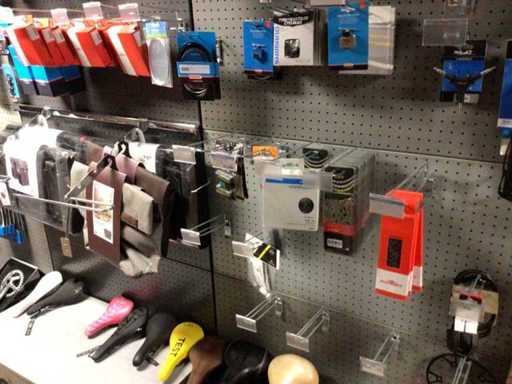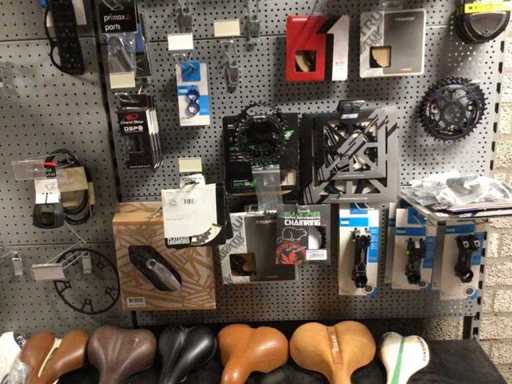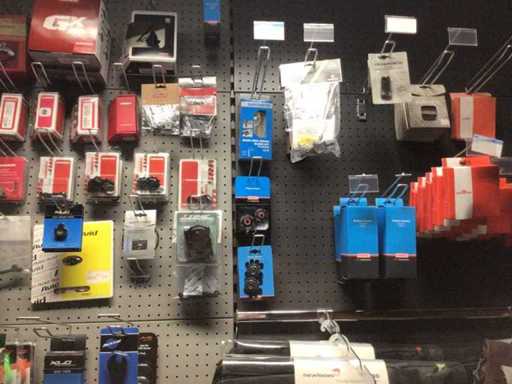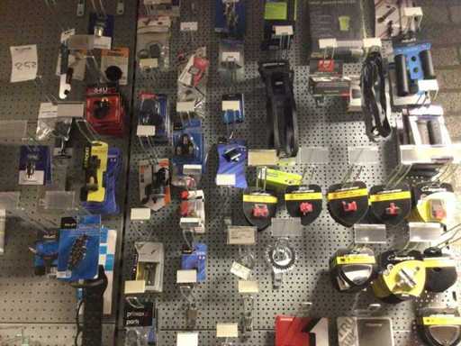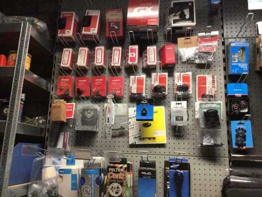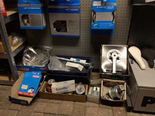 Partij fietsonderdelen op wandstelling