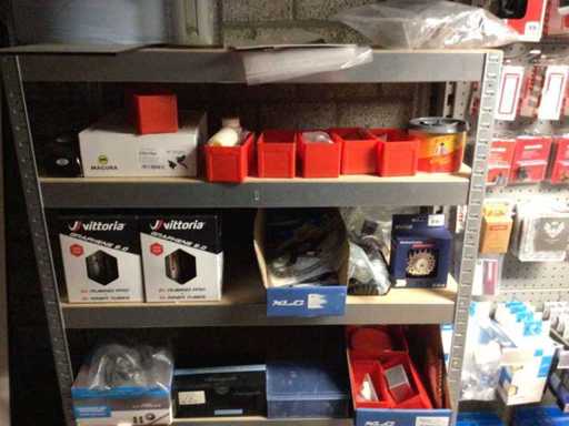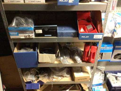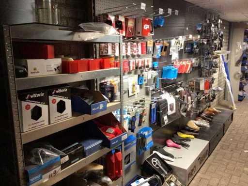 Partij fietsonderdelen op ca 6 meter wandstelling, exclusief wandstelling