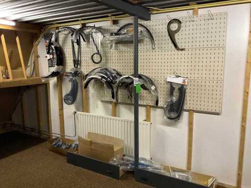 Partij fiets onderdelen/ accessoires aan wandstelling en in houten bakken, incl houten bakken, excl wandstelling