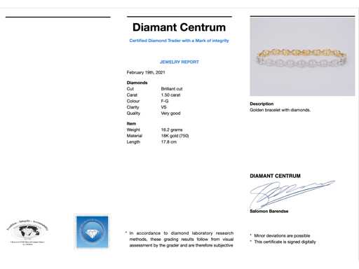 Diamant: Natuurlijk; Aantal: 157 stuks; Slijpvorm: Briljant geslepen; Gewicht (carat): 1.50 carat; Kleur: F-G; Zuiverheid: VS; Slijpkwaliteit: Zeer mooi; Juweel: Armband; Gewicht: 16.2 gram; Afmetingen/lengte: 17,8 cm; Materiaal: 18K goud (750); Conditie: Nieuw; Verpakking: Luxe sieradendoos; Toelichting: De kwaliteit is overgenomen van het rapport behorend bij item. De waardebepaling is een beoordeling van een gecertificeerde diamantair, gebaseerd op consumentenprijzen.; Consumentenprijs: € 15.453,-