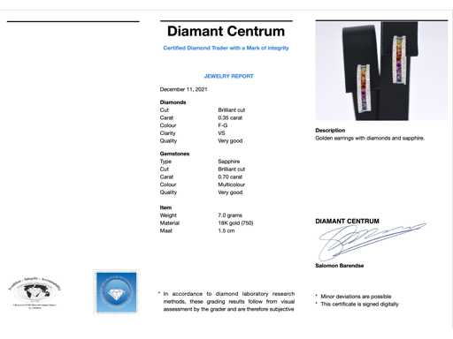 Diamant: Natuurlijk; Aantal: 68 stuks; Slijpvorm: Briljant geslepen; Gewicht (carat): 0.35 carat; Kleur: F-G; Zuiverheid: VS; Slijpkwaliteit: Zeer mooi; Edelsteen: Saffieren; Aantal: 18 stuks; Slijpvorm: Briljant geslepen; Gewicht (carat): 0.70 carat; Kleur: Multicolour; Slijpkwaliteit: Very good; Juweel: oorbellen; Gewicht: 7 gram; Afmetingen/lengte: 1,5cm; Materiaal: 18K goud (750); Conditie: Nieuw; Verpakking: Luxe sieradendoos; Toelichting: De kwaliteit is overgenomen van het rapport behorend bij item. De waardebepaling is een beoordeling van een gecertificeerde diamantair, gebaseerd op consumentenprijzen.; Consumentenprijs: € 6.930,-