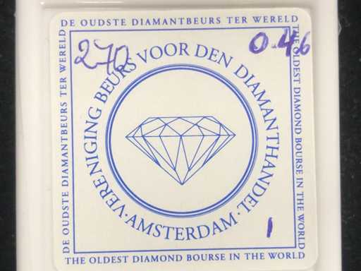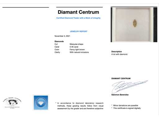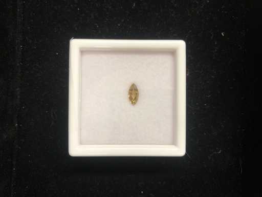 Diamant: Natuurlijk; Aantal: 1 stuk; Slijpvorm: Marquise geslepen; Gewicht (carat): 0.46 carat; Kleur: Cognac - bruin.; Zuiverheid: Met natuurlijke insluitsels; Conditie: Nieuw; Verpakking: Edelsteendoos; Toelichting: De kwaliteit is overgenomen van het rapport behorend bij item. De waardebepaling is een beoordeling van een gecertificeerde diamantair, gebaseerd op consumentenprijzen.; Consumentenprijs: € 1.440 - 1.800,-