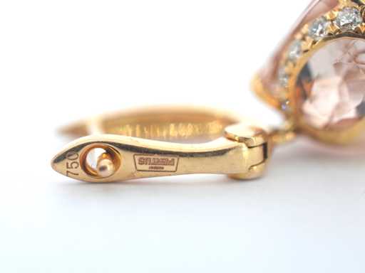 Diamant: Natuurlijk; Aantal: ca. 60 stuks; Slijpvorm: Briljant geslepen; Gewicht (carat): 1.20 carat; Kleur: D-E; Zuiverheid: VVS; Slijpkwaliteit: Excellent; Edelsteen: Morganiet; Aantal: 10 stuks; Slijpvorm: kussen en ovaal vorm; Gewicht (carat): 6.00 carat totaal; Kleur: Zalm kleur; Zuiverheid: Zeer hoge zuiverheidsgraad; Slijpkwaliteit: Heel mooi; Juweel: Oorbellen; Gewicht: 7 gram; Materiaal: 18K goud (750); Conditie: Zo goed als nieuw; Verpakking: Luxe sieradendoos; Toelichting: De kwaliteit is overgenomen van het rapport behorend bij item. De waardebepaling is een beoordeling van een gecertificeerde diamantair, gebaseerd op consumentenprijzen.; Consumentenprijs: € 12.000,-
