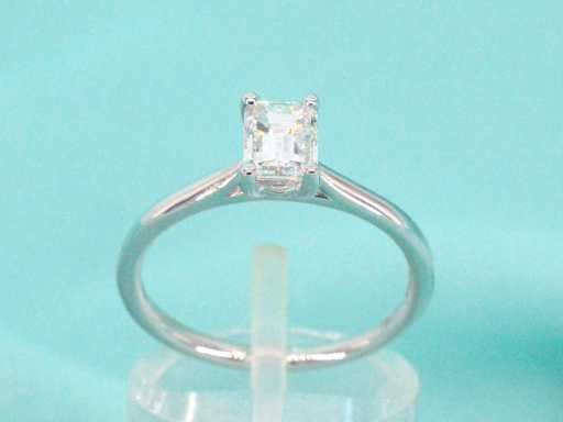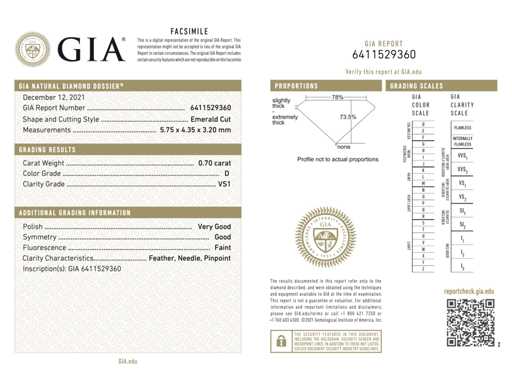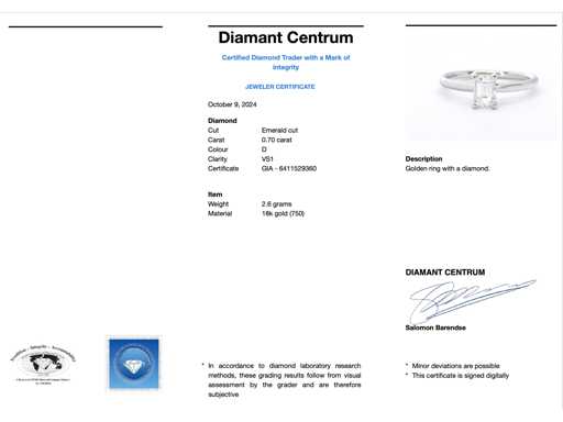Diamant: Natuurlijk; Aantal: 1 stuk; Slijpvorm: Emerald geslepen; Gewicht (carat): 0.70 carat; Kleur: D; Zuiverheid: VS1; Certificaat: GIA; Certificaat nummer: 6411529360; Juweel: Ring; Gewicht: 2.6 gram; Ringmaat (op maat gemaakt*): 53 (17 mm); Materiaal: 18K goud (750); Conditie: Nieuw; Verpakking: Luxe sieradendoos; Toelichting: De kwaliteit is overgenomen van het rapport behorend bij item. De waardebepaling is een beoordeling van een gecertificeerde diamantair, gebaseerd op consumentenprijzen.; Consumentenprijs: € 12.000,-