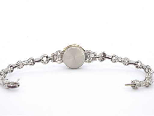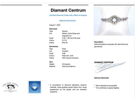 Diamant: Natuurlijk; Aantal: 8 stuks; Slijpvorm: Briljant geslepen; Gewicht (carat): 0.40 carat; Kleur: F-G; Zuiverheid: VS; Slijpkwaliteit: Uit de tijd geslepen; Diamant (secundair): Natuurlijk; Aantal diamanten: 9 stuks; Slijpvorm: Carré geslepen; Gewicht (carat): 1.50 carat; Kleur: E; Zuiverheid: VVS; Slijpkwaliteit: Zeer mooi; Diamant (secundair): Natuurlijk; Slijpvorm: Swiss en baguette geslepen; Gewicht (carat): 2.00 carat; Kleur: F-G; Zuiverheid: VS; Edelsteen: Robijn; Aantal: 24 stuks; Slijpvorm: Gefacetteerd; Gewicht (carat): 0.80 carat; Kleur: Robijn rood - roze; Zuiverheid: Met natuurlijke insluitsels; Juweel: Armband; Gewicht: 23.8 gram; Afmetingen/lengte: 17.5 cm; Materiaal: Goud en platina; Conditie: Vintage; Verpakking: Luxe sieradendoos; Toelichting: De kwaliteit is overgenomen van het rapport behorend bij item. De waardebepaling is een beoordeling van een gecertificeerde diamantair, gebaseerd op consumentenprijzen.; Consumentenprijs: € 28.000,-