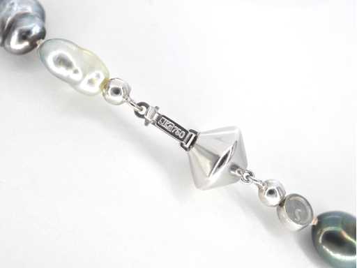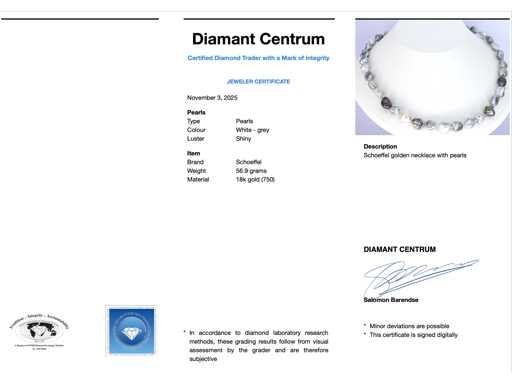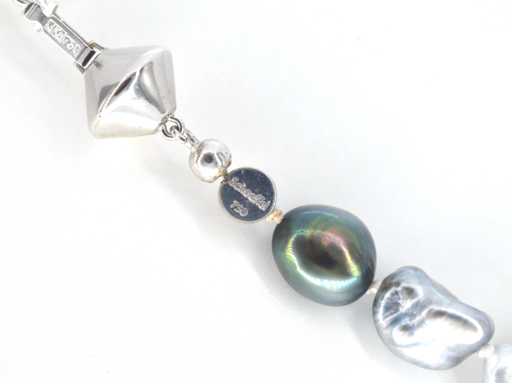 Parel: Parels; Kleur: wit - grijs ; Luster: Glanzend; Juweel: Halsketting; Merk: Schoeffel; Gewicht: 40 gram; Afmetingen/lengte: 48 cm; Materiaal: 18K goud (750); Conditie: Zo goed als nieuw; Verpakking: Luxe sieradendoos; Toelichting: De kwaliteit is overgenomen van het rapport behorend bij item. De waardebepaling is een beoordeling van een gecertificeerde diamantair, gebaseerd op consumentenprijzen.; Consumentenprijs: € 5.775,-