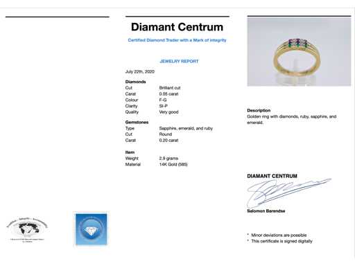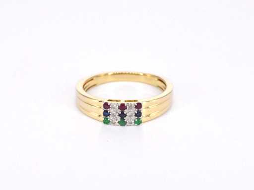 Diamant: Natuurlijk; Slijpvorm: Briljant geslepen; Gewicht (carat): 0.05 carat; Kleur: F-G; Zuiverheid: SI-P; Slijpkwaliteit: Zeer mooi; Edelsteen: Saffier, smaragd en robijn; Slijpvorm: Rond geslepen; Gewicht (carat): 0.20 carat; Juweel: Ring; Gewicht: 2.9 gram; Ringmaat (op maat gemaakt*): 54 (17.25 mm); Materiaal: 14k goud (585); Conditie: Nieuw; Verpakking: Luxe sieradendoos; Toelichting: De kwaliteit is overgenomen van het rapport behorend bij item. De waardebepaling is een beoordeling van een gecertificeerde diamantair, gebaseerd op consumentenprijzen.; Consumentenprijs: € 1.698,-