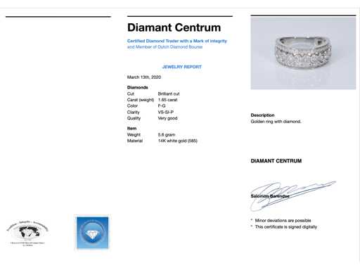 Diamant: Natuurlijk; Slijpvorm: Briljant geslepen; Gewicht (carat): 1.65 carat; Kleur: F-G; Zuiverheid: SI-P; Slijpkwaliteit: Zeer mooi; Juweel: Ring; Gewicht: 5.6 gram; Ringmaat (op maat gemaakt*): 54 (17.25 mm); Materiaal: 14 karaat (585); Conditie: Nieuw; Verpakking: Luxe sieradendoos; Toelichting: De kwaliteit is overgenomen van het rapport behorend bij item. De waardebepaling is een beoordeling van een gecertificeerde diamantair, gebaseerd op consumentenprijzen.; Consumentenprijs: € 6.930,-
