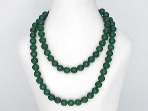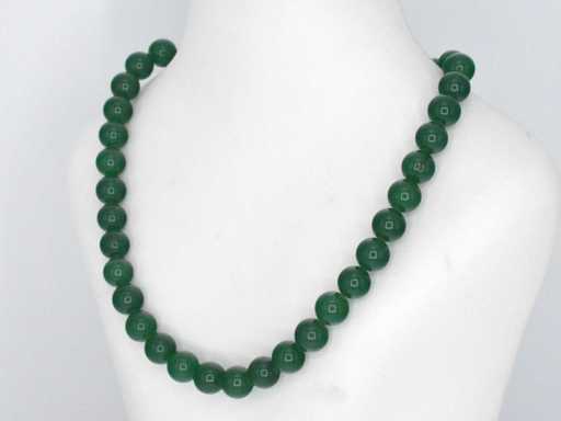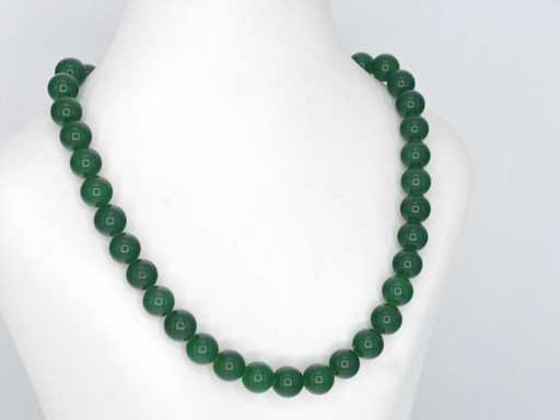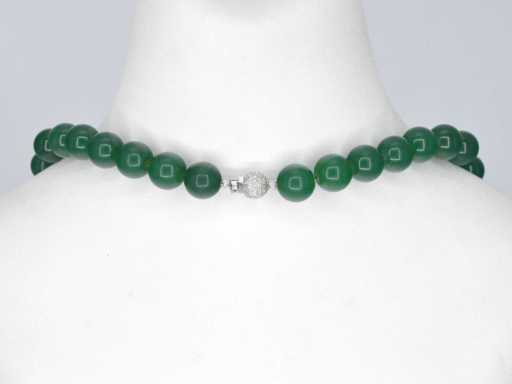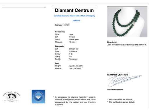 Diamant: Natuurlijk; Slijpvorm: Briljant geslepen; Gewicht (carat): 0.50 carat; Kleur: F-G; Zuiverheid: VS; Slijpkwaliteit: Heel goed; Edelsteen: Jade; Slijpvorm: Rond; Kleur: Intens groen; Afmetingen: 10 mm; Kwaliteit: Mooi glanzend; Juweel: Collier; Gewicht: ca. 80 gram; Afmetingen/lengte: ca. 70.0 cm; Materiaal: 14k goud (585); Conditie: Nieuw; Verpakking: Luxe sieradendoos; Toelichting: De kwaliteit is overgenomen van het rapport behorend bij item. De waardebepaling is een beoordeling van een gecertificeerde diamantair, gebaseerd op consumentenprijzen.; Extra informatie: Sluiting: 14K goud (585) met diamanten; Consumentenprijs: € 3.080,-
