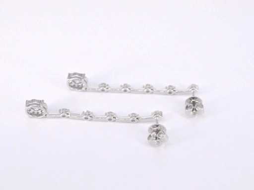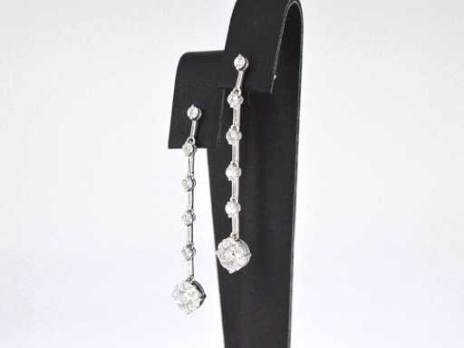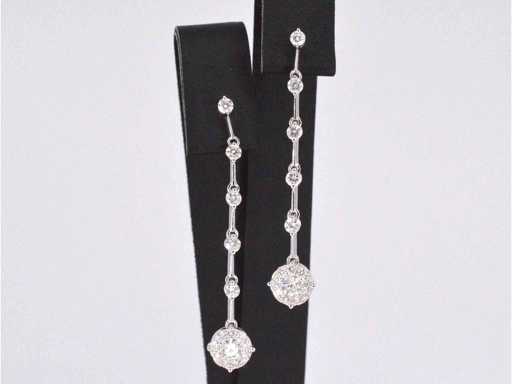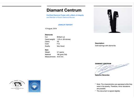 Diamant: Natuurlijk; Aantal: 30 stuks; Slijpvorm: Briljant geslepen; Gewicht (carat): 1.20 carat; Kleur: F-G; Zuiverheid: VS; Slijpkwaliteit: Zeer mooi; Juweel: Oorhanger; Gewicht: 3.7 gram; Afmetingen/lengte: 43 mm; Materiaal: 18K goud (750); Conditie: Nieuw; Verpakking: Luxe sieradendoos; Toelichting: De kwaliteit is overgenomen van het rapport behorend bij item. De waardebepaling is een beoordeling van een gecertificeerde diamantair, gebaseerd op consumentenprijzen.; Consumentenprijs: € 9.398,-