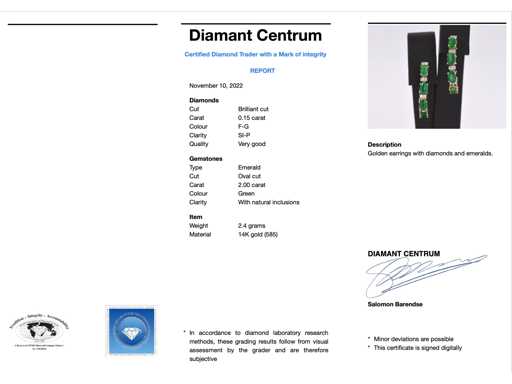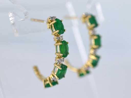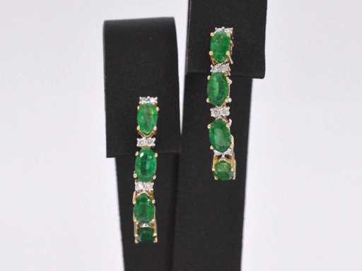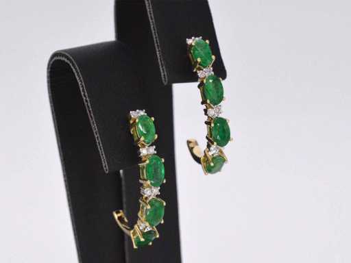 Diamant: Natuurlijk; Slijpvorm: Briljant geslepen; Gewicht (carat): 0.15 carat; Kleur: F-G; Zuiverheid: SI-P; Slijpkwaliteit: Zeer mooi; Edelsteen: Smaragd; Slijpvorm: Ovaal geslepen; Gewicht (carat): 2.00 carat; Juweel: Oorbellen; Gewicht: 2.4 gram; Materiaal: 14 karaat (585); Conditie: Nieuw; Verpakking: Luxe sieradendoos; Toelichting: De kwaliteit is overgenomen van het rapport behorend bij item. De waardebepaling is een beoordeling van een gecertificeerde diamantair, gebaseerd op consumentenprijzen.; Consumentenprijs: € 1.768,-