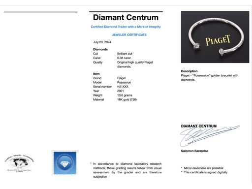 Diamant: Natuurlijk; Aantal: 30 stuks; Slijpvorm: Briljant geslepen; Gewicht (carat): 0.38 carat; Extra informatie: Originele Piaget diamanten van hoge kwaliteit; Juweel: Armband; Merk: Piaget; Model: Posession; Serienummer: H21XXX; Jaar: 2021; Gewicht: 13.6 gram; Afmetingen/lengte: Maat: 17; Materiaal: 18k goud (750); Conditie: Zo goed als nieuw; Verpakking: Origineel sieradendoos; Toelichting: De kwaliteit is overgenomen van het rapport behorend bij item. De waardebepaling is een beoordeling van een gecertificeerde diamantair, gebaseerd op consumentenprijzen.; Extra informatie: Komt met originele doos en papieren.; Consumentenprijs: € 8.250,-