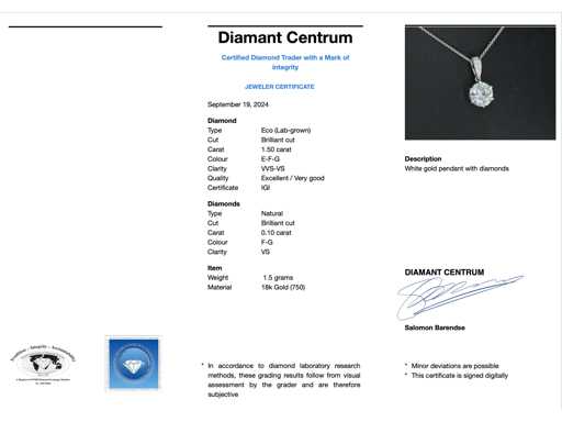 Diamant: Eco (Lab-grown); Aantal: 1 stuk; Slijpvorm: Briljant geslepen; Gewicht (carat): 1.50 carat; Kleur: E-F-G; Zuiverheid: VVS-VS; Slijpkwaliteit: Excellent / Very good; Certificaat: IGI; Diamant (secundair): Natuurlijke diamanten; Aantal diamanten: 5 stuks; Slijpvorm: Briljant geslepen; Gewicht (carat): 0.10 carat; Kleur: F-G; Zuiverheid: VS; Slijpkwaliteit: Zeer mooi; Juweel: Hanger (Excl. Ketting); Gewicht: 1.5 gram; Materiaal: 18k goud (750); Conditie: Nieuw; Verpakking: Luxe sieradendoos; Toelichting: De kwaliteit is overgenomen van het rapport behorend bij item. De waardebepaling is een beoordeling van een gecertificeerde diamantair, gebaseerd op consumentenprijzen.; Consumentenprijs: € 2.980,-
