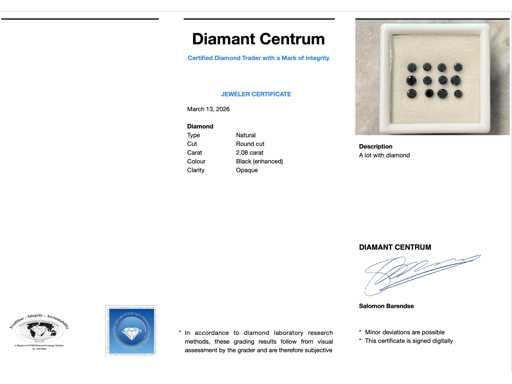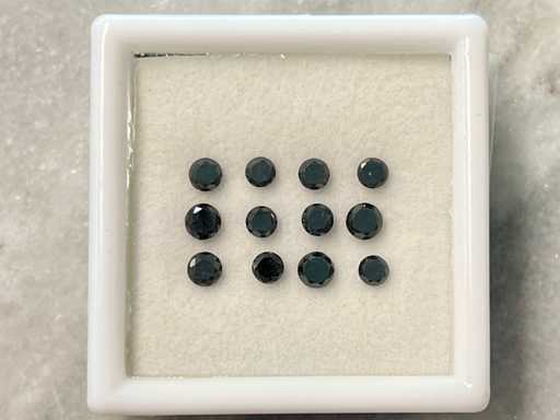 Diamant: Natuurlijk; Aantal: 12 stuks; Slijpvorm: Rond geslepen; Gewicht (carat): 2.08 carat; Kleur: Zwart (enhanced); Zuiverheid: Opaak; Conditie: Nieuw; Verpakking: Edelsteendoos; Toelichting: De kwaliteit is overgenomen van het rapport behorend bij item. De waardebepaling is een beoordeling van een gecertificeerde diamantair, gebaseerd op consumentenprijzen.; Extra informatie: Aan de oppervlakte van deze diamanten zitten nog natuurlijke kenmerken van ruwe diamant, dit kan voor een leek lijken op beschadigingen; Consumentenprijs: € 1.840,-