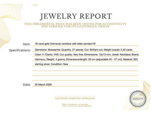 Edelsteen: Moissaniet; Aantal: 27 stuks; Slijpvorm: Briljant geslepen; Gewicht (carat): 3.40 carat; Kleur: F; Zuiverheid: VVS; Slijpkwaliteit: Zeer mooi; Afmetingen: 10x13 mm; Juweel: Halsketting; Merk: Harmony; Gewicht: 4 gram; Afmetingen/lengte: 50 cm (verstelbaar 45 - 47 cm); Materiaal: 925 sterling zilver; Conditie: Nieuw; Verpakking: sieradendoos of fluwelen etui; Toelichting: De kwaliteit is overgenomen van het rapport behorend bij item. De waardebepaling is een beoordeling van een gecertificeerde diamantair, gebaseerd op consumentenprijzen.; Extra informatie: Hanger afmeting: 10x13 mm; Consumentenprijs: € 750,-