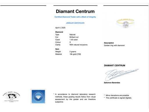 Diamant: Natuurlijk; Aantal: 1 stuk; Slijpvorm: Briljant geslepen; Gewicht (carat): 1.50 carat; Kleur: Commercial (X); Zuiverheid: Met natuurlijke insluitsels (P); Slijpkwaliteit: Zeer goed; Juweel: Ring; Gewicht: 2 gram; Ringmaat (op maat gemaakt*): 53 (17 mm); Materiaal: 18K goud (750); Conditie: Nieuw; Verpakking: Luxe sieradendoos; Toelichting: De kwaliteit is overgenomen van het rapport behorend bij item. De waardebepaling is een beoordeling van een gecertificeerde diamantair, gebaseerd op consumentenprijzen.; Consumentenprijs: € 7.480,-
