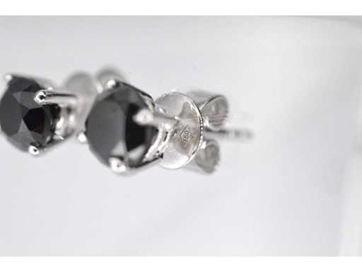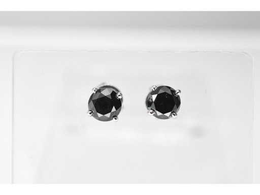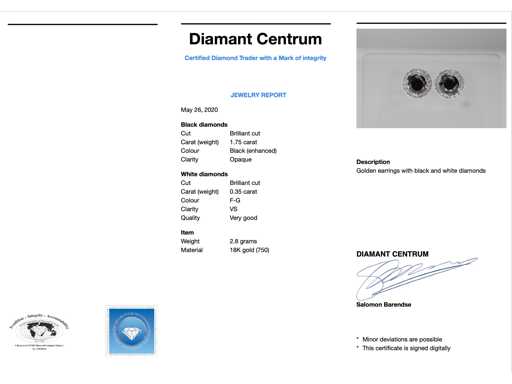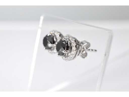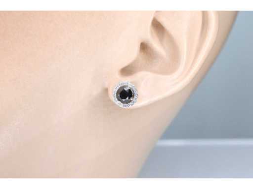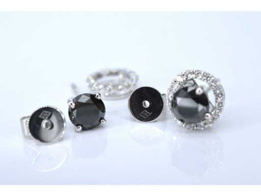 Diamant: Natuurlijk; Aantal: 2 stuks; Slijpvorm: Briljant geslepen; Gewicht (carat): 1.75 carat; Kleur: Zwart; Zuiverheid: Opaak (enhanced); Slijpkwaliteit: Goed; Diamant (secundair): Entourage; Slijpvorm: Briljant geslepen; Gewicht (carat): 0.35 carat; Kleur: F; Zuiverheid: VS; Juweel: Oorbellen; Gewicht: 2.8 gram; Materiaal: 18K goud (750); Conditie: Nieuw; Verpakking: Luxe sieradendoos; Toelichting: De kwaliteit is overgenomen van het rapport behorend bij item. De waardebepaling is een beoordeling van een gecertificeerde diamantair, gebaseerd op consumentenprijzen.; Consumentenprijs: € 5.005,-