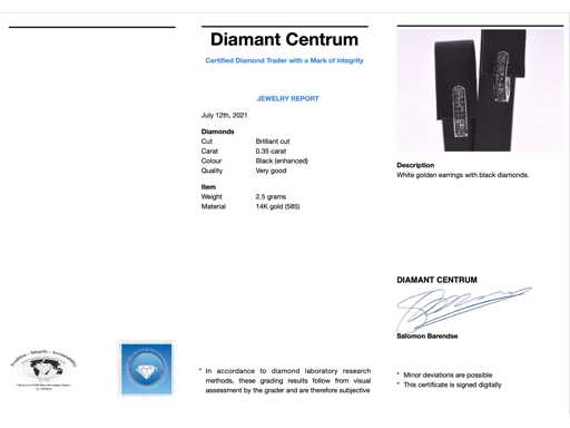Diamant: Natuurlijk; Slijpvorm: Briljant geslepen; Gewicht (carat): 0.35 carat; Kleur: zwart (enhanced); Slijpkwaliteit: mooi; Juweel: Oorbellen; Gewicht: 2.5 gram; Afmetingen/lengte: 12 mm; Materiaal: 14 karaat (585); Conditie: Nieuw; Verpakking: Luxe sieradendoos; Toelichting: De kwaliteit is overgenomen van het rapport behorend bij item. De waardebepaling is een beoordeling van een gecertificeerde diamantair, gebaseerd op consumentenprijzen.; Consumentenprijs: € 2.188,-