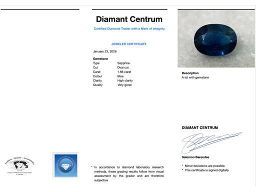 Edelsteen: Saffier; Aantal: 1 stuk; Slijpvorm: Ovaal geslepen; Gewicht (carat): 1.66 carat; Kleur: Blauw; Zuiverheid: Hoog zuiverheidsgraad; Slijpkwaliteit: Heel mooi; Conditie: Nieuw; Verpakking: Edelsteendoos; Toelichting: De kwaliteit is overgenomen van het rapport behorend bij item. De waardebepaling is een beoordeling van een gecertificeerde diamantair, gebaseerd op consumentenprijzen.; Extra informatie: Onbehandelde saffier is zeer zeldzaam en geschikt voor investering; Consumentenprijs: € 10.000,-