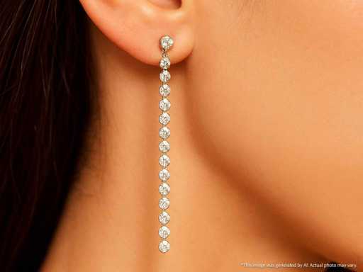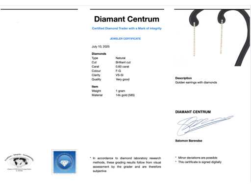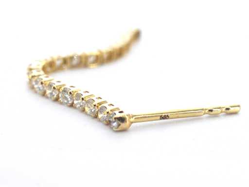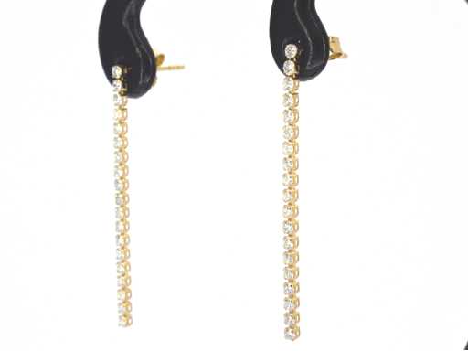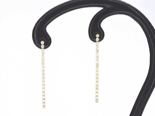 Diamant: Natuurlijk; Aantal: 38 stuks; Slijpvorm: Briljant geslepen; Gewicht (carat): 0.60 carat; Kleur: F-G; Zuiverheid: VS-SI; Slijpkwaliteit: Zeer mooi; Juweel: Oorbellen; Gewicht: 1 gram; Afmetingen/lengte: 3.4 x 0.1 cm; Materiaal: 14 karaat (585); Conditie: Nieuw; Verpakking: Luxe sieradendoos; Toelichting: De kwaliteit is overgenomen van het rapport behorend bij item. De waardebepaling is een beoordeling van een gecertificeerde diamantair, gebaseerd op consumentenprijzen.; Consumentenprijs: € 3.185,-