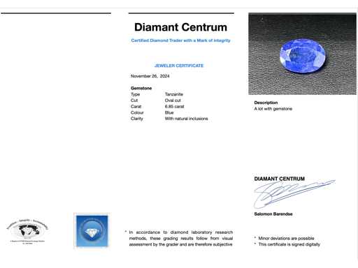 Edelsteen: Tanzaniet; Aantal: 1 stuk; Slijpvorm: Ovaal geslepen; Gewicht (carat): 6.85 carat; Kleur: Blauw; Zuiverheid: Met natuurlijke insluitsels; Conditie: Nieuw; Verpakking: Edelsteendoos; Toelichting: De kwaliteit is overgenomen van het rapport behorend bij item. De waardebepaling is een beoordeling van een gecertificeerde diamantair, gebaseerd op consumentenprijzen.; Consumentenprijs: € 2.780,-