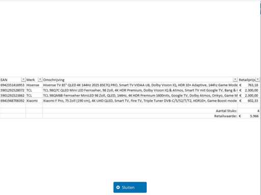 Dit betreft een partij televisies retourgoederen van een grote online retailer. De partij bestaat uit diverse diverse maten televisies. Aantal stuks: 4. Retailwaarde: €5966,- De televisies zijn niet werkend en zijn te gebruiken voor onderdelen. Kom op de kijkdag om te om zo een goed beeld te krijgen van de reden van retour. Zie foto's voor lijst met inhoud.