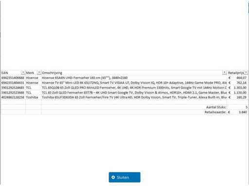 Dit betreft een partij televisies retourgoederen van een grote online retailer. De partij bestaat uit diverse diverse maten televisies. Aantal stuks: 5. Retailwaarde: €3840,- De televisies zijn niet werkend en zijn te gebruiken voor onderdelen. Kom op de kijkdag om te om zo een goed beeld te krijgen van de reden van retour. Zie foto's voor lijst met inhoud.