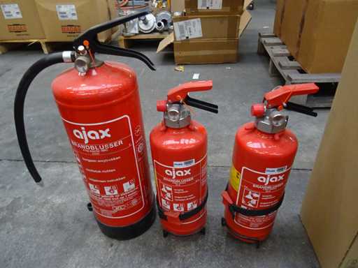 2 x 6 liter schuimblusser in verpakking, en 3 blussers met keuring waarvan 2 x schuimblusser 2L en 1 x poederblusser 6 kg