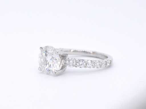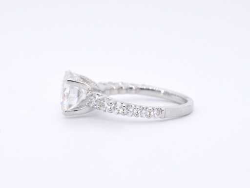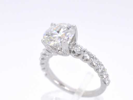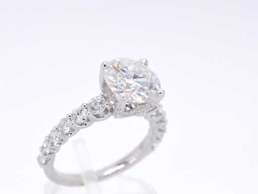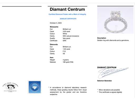 Diamant: Natuurlijk; Slijpvorm: Briljant geslepen; Gewicht (carat): 1.00 carat totaal; Kleur: F-G; Zuiverheid: VS; Edelsteen: Moisanniet; Slijpvorm: Briljant geslepen; Gewicht (carat): 3.00 carat; Kleur: Wit; Zuiverheid: Zeer zuiver; Slijpkwaliteit: Very good; Juweel: Ring; Gewicht: 4 gram; Ringmaat (op maat gemaakt*): 53 (17 mm); Materiaal: 18K goud (750); Conditie: Nieuw; Verpakking: Luxe sieradendoos; Toelichting: De kwaliteit is overgenomen van het rapport behorend bij item. De waardebepaling is een beoordeling van een gecertificeerde diamantair, gebaseerd op consumentenprijzen.; Extra informatie: Het gemeten gewicht van de edelstenen is volgens diamant maten; Consumentenprijs: € 18.000,-