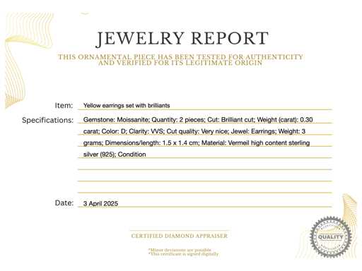 Edelsteen: Moissaniet; Aantal: 2 stuks; Slijpvorm: Briljant geslepen; Gewicht (carat): 0.30 carat; Kleur: D; Zuiverheid: VVS; Slijpkwaliteit: Zeer mooi; Juweel: Oorbellen; Merk: Harmony; Gewicht: 3 gram; Afmetingen/lengte: 1.5 x 1.4 cm; Materiaal: Vermeil hoog gehalte sterling zilver (925); Conditie: Nieuw; Verpakking: Sieradendoos of fluwelen etui; Toelichting: De kwaliteit is overgenomen van het rapport behorend bij item. De waardebepaling is een beoordeling van een gecertificeerde diamantair, gebaseerd op consumentenprijzen.; Extra informatie: Het gemeten gewicht van de edelstenen is volgens diamant maten; Consumentenprijs: € 800,-