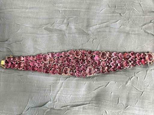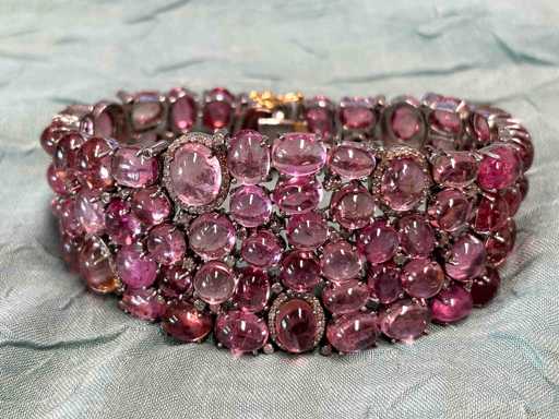 Diamant: Echte Natuurlijk diamanten; Gewicht (carat): 2.00 carat; Zuiverheid: Met natuurlijke insluitsels; Edelsteen: Natuurlijke toermalijnen; Slijpvorm: Ovaal cabochon; Gewicht (carat): 130.00 carat; Kleur: Roze; Zuiverheid: Mat natuurlijke insluitsels; Juweel: Armband; Gewicht: 55 gram; Afmetingen/lengte: 18 cm; Materiaal: Hoge kwaliteit Sterling zilver; Conditie: Vintage; Verpakking: Sieradendoos of fluwelen etui; Toelichting: De kwaliteit is overgenomen van het rapport behorend bij item. De waardebepaling is een beoordeling van een gecertificeerde diamantair, gebaseerd op consumentenprijzen.; Extra informatie: Dit is een met de hand vervaardigd sieraad.; Consumentenprijs: € 10.000,-