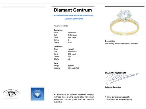 Diamant: Natuurlijk; Aantal: 12 stuks; Slijpvorm: Briljant geslepen; Gewicht (carat): 0.30 carat; Kleur: F-G; Zuiverheid: VS; Slijpkwaliteit: Zeer mooi; Edelsteen: Moissaniet; Slijpvorm: Briljant geslepen; Gewicht (carat): 2.00 carat; Kleur: D; Juweel: Ring; Gewicht: 3 gram; Ringmaat (op maat gemaakt*): 53 (17 mm); Materiaal: 18k goud (750); Conditie: Nieuw; Verpakking: Luxe sieradendoos; Toelichting: De kwaliteit is overgenomen van het rapport behorend bij item. De waardebepaling is een beoordeling van een gecertificeerde diamantair, gebaseerd op consumentenprijzen.; Extra informatie: Het gemeten gewicht van de edelstenen is volgens diamant maten; Consumentenprijs: € 7.680,-